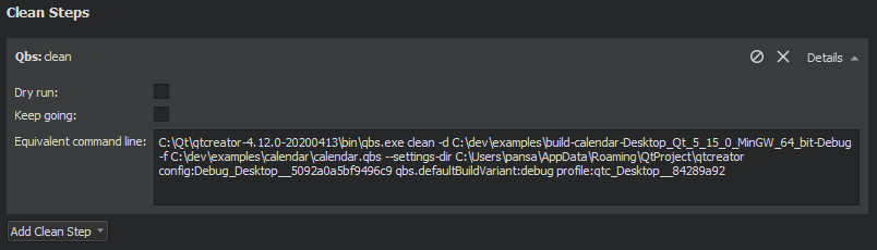 注意: On Windows, the build will fail if the application is running, because the executable file cannot be overwritten. To avoid this issue, you can deselect this check box and add a Qbs Install deployment step in the run settings that will be performed just before running the application.