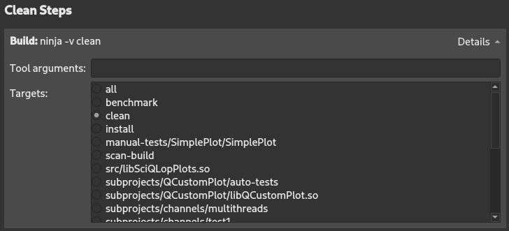 When building with Meson, you can add arguments and targets for the clean command in Clean Steps .