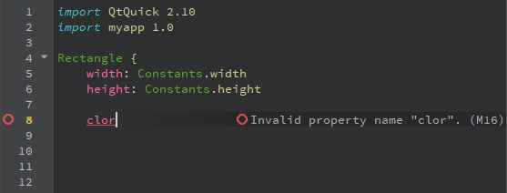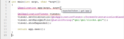 As you write code, Qt Creator checks code syntax. When Qt Creator spots a syntax error in your code it underlines it and shows error details when you move the mouse pointer over the error. Similarly, when you are working on an instance of a JavaScript object notation (JSON) entity, Qt Creator underlines errors in JSON data structure.