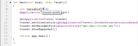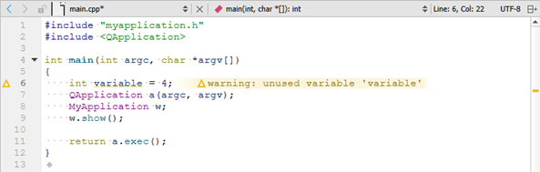 In the following screenshot, Qt Creator issues a warning, because the variable is not used: