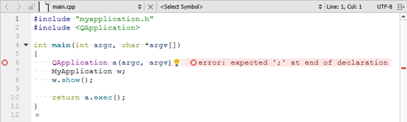 In the following screenshot, Qt Creator points out an error, because a semicolon is missing at the end of the line: