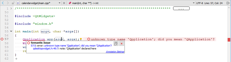 When using the Clang code model, errors and warnings are additionally marked with icons and annotated. If a