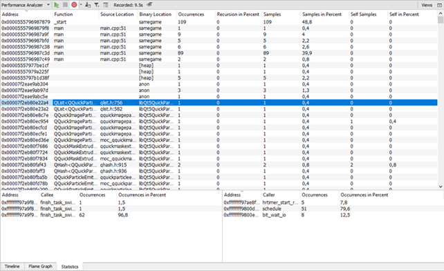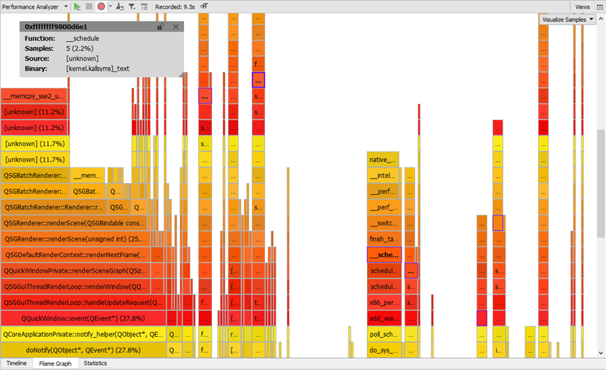 Qt Creator is integrated with the Linux Perf tool that can be used to analyze the CPU and memory usage of an application on embedded devices and, to a limited extent, on Linux desktop platforms. The Performance Analyzer uses the Perf tool bundled with the Linux kernel to take periodic snapshots of the call chain of an application and visualizes them in a timeline view or as a flame graph.