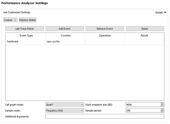 To specify global settings for the Performance Analyzer, select 工具 > Options > Analyzer > CPU Usage . For each run configuration, you can also use specialized settings. Select Projects > 运行 , and then select 细节 next to Performance Analyzer Settings .
