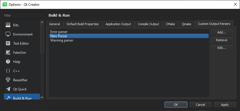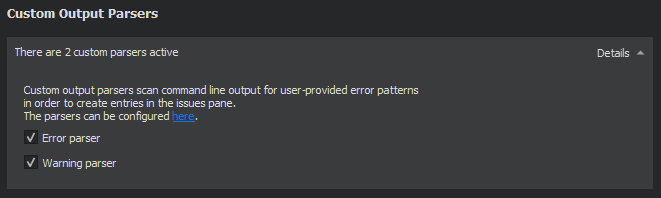 Custom output parsers scan command line output for error and warning patterns that you specify and create entries for found patterns in the