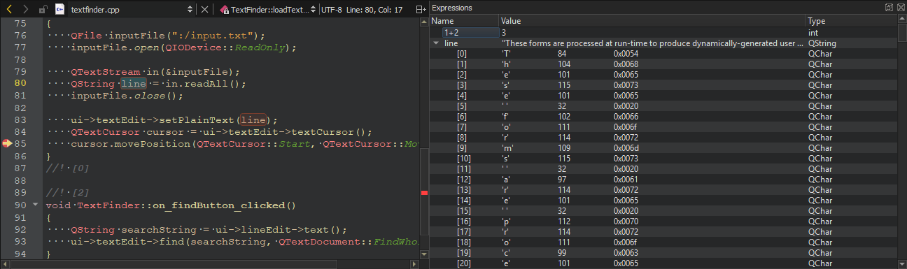 Qt Creator displays the raw information provided by the native debuggers in a clear and concise manner with the goal to simplify the debugging process as much as possible without losing the power of the native debuggers.