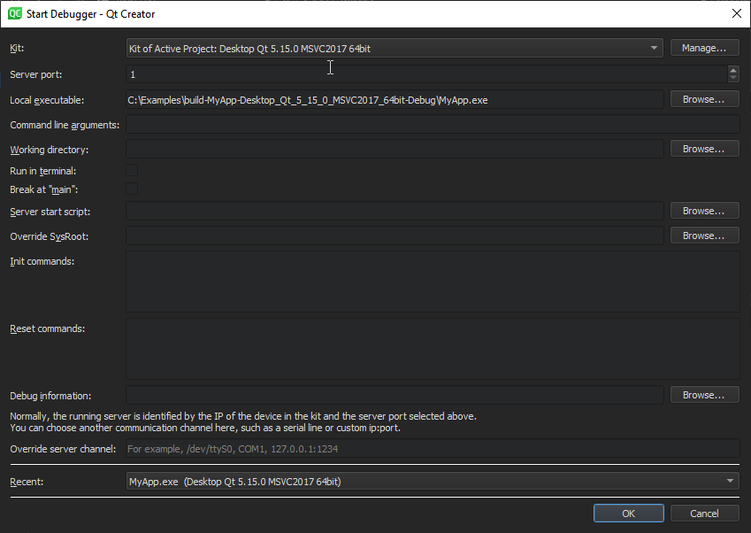 In general, F5 和 Start Debugging of Startup Project button are set up in a way to start the operating mode that is commonly used in a given context. So if the current project is set up as a C++ application using the MinGW toolchain targeting desktop Windows, the GDB engine will be started in Start Internal mode. If the current project is a QML application using C++ plugins, a "mixed" QML/C++ engine will be started, with the C++ parts being handled by GDB and GDB server remote debugging.