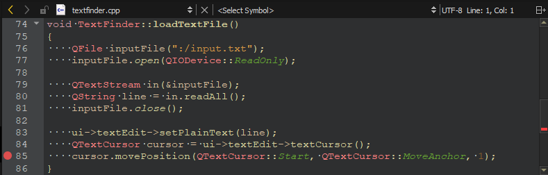 TextFinder reads a text file into QString and then displays it with QTextEdit . To look at the TextFinder class and see the stored data, place a breakpoint in textfinder.cpp, as follows: