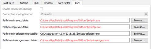You can protect the connections between Qt Creator and a device by using an OpenSSH connection. OpenSSH is a connectivity tool for remote login using the SSH protocol. The OpenSSH suite is not delivered with Qt Creator, so you must download it and install it on the development PC. Then, you must configure the paths to the tools in Qt Creator. For more information, see Configuring SSH Connections .
