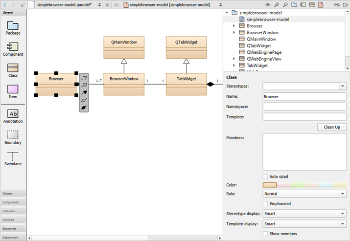For more information about the available options, see standard.def 在 share/qtcreator/modeleditor directory in the Qt Creator installation directory. It describes also how to define custom relation types and templates for existing types (such as a composition relation that can be drawn between classes).