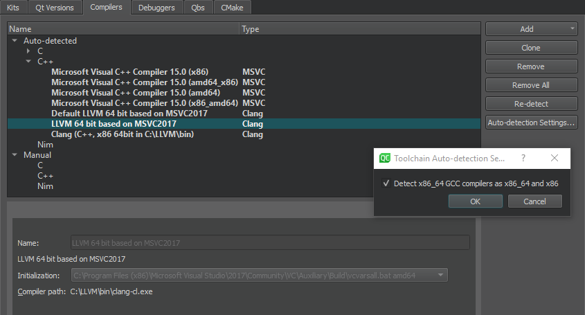 When Qt Creator finds an x86_64 GCC compiler, it sets up an instance for the native x86_64 target. If you plan to create also 32-bit x86 binaries without using a dedicated cross-compiler, select Auto-detection Settings > Detect x86_64 GCC compilers as x86_64 and x86 . Then select Re-detect to refresh the list of automatically detected compilers.