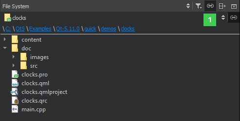 Some build systems support adding and removing files to a project in Qt Creator (currently qmake and Qbs). The faithful display of the project structure allows to specify exactly where a new file should be placed in the build system. If the project is under version control, information from the version control system might be displayed in brackets after the project name. This is currently implemented for Git (the branch name or a tag is displayed) and ClearCase (the view name is displayed). You can use the project tree in the following ways: