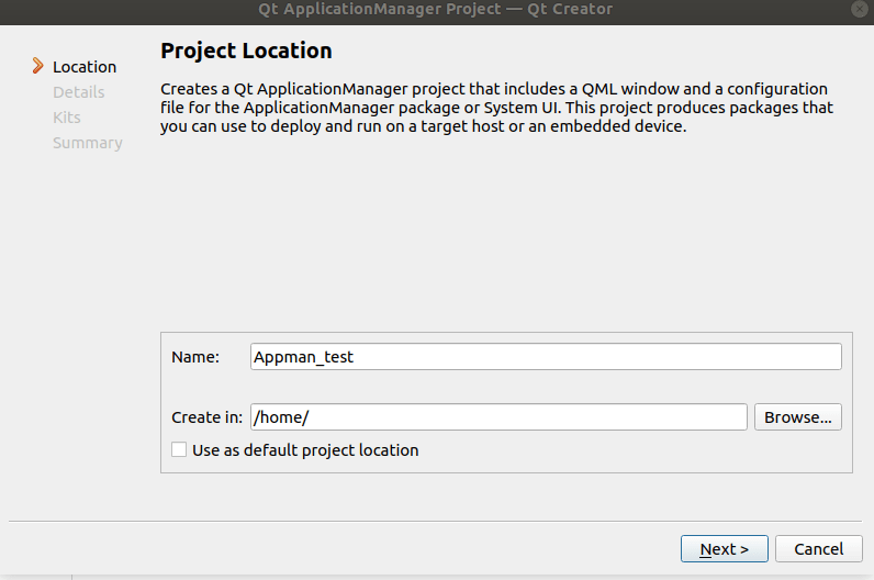 The Qt Application Manager project wizard provides you with a step-by-step guidance through a project creation process. The wizard prompts you to select the type of the project to create, as well as the location for it and the build tool used to build it. You can create two types of projects using this wizard: a System UI or an application that can be run under the System UI. For more details, see The Qt Application Manager .