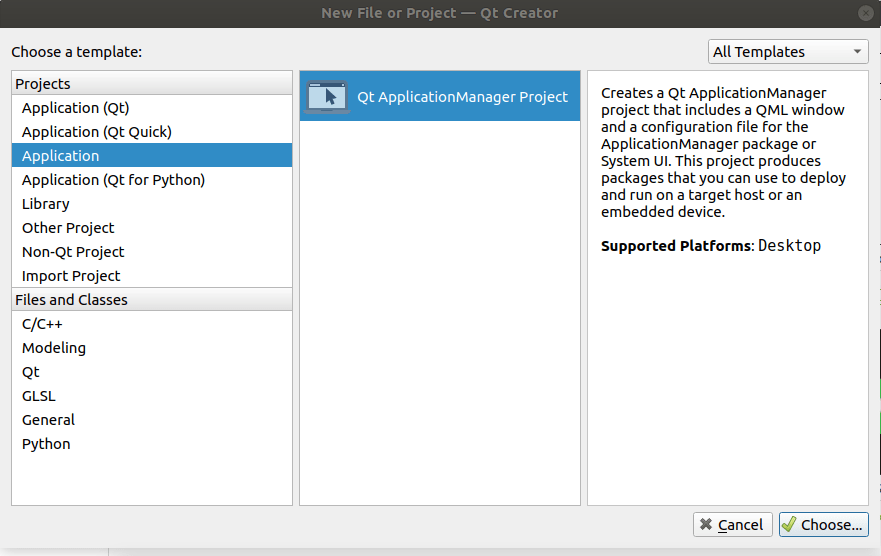 Create Qt Application Manager project by selecting the File > New File or Project > 应用程序 > Qt ApplicationManager Project > Choose .