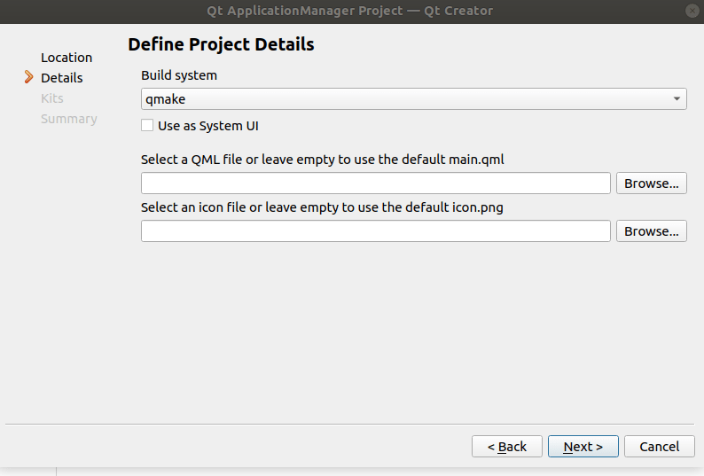 Select the type of the Qt Application Manager project (for more details see The Qt Application Manager ). To choose System UI type, set the checkbox Use as System UI , otherwise keep it unset.