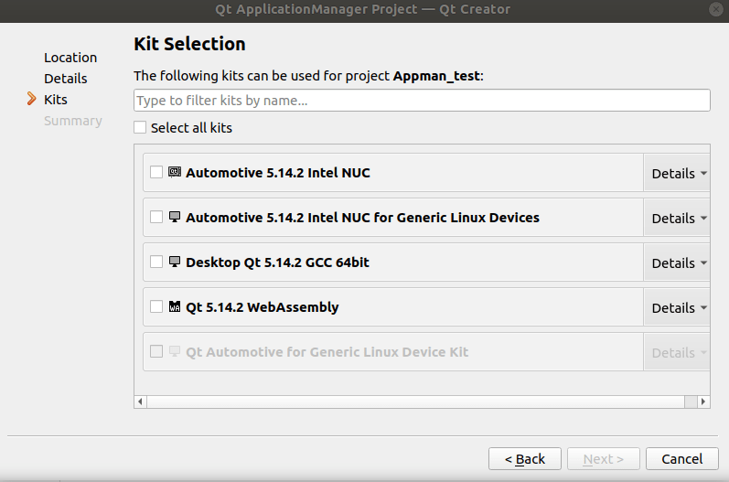 Select kits for the platforms to build the project for. For more information on how to add kits see Add Kits for Qt Application Manager Devices
